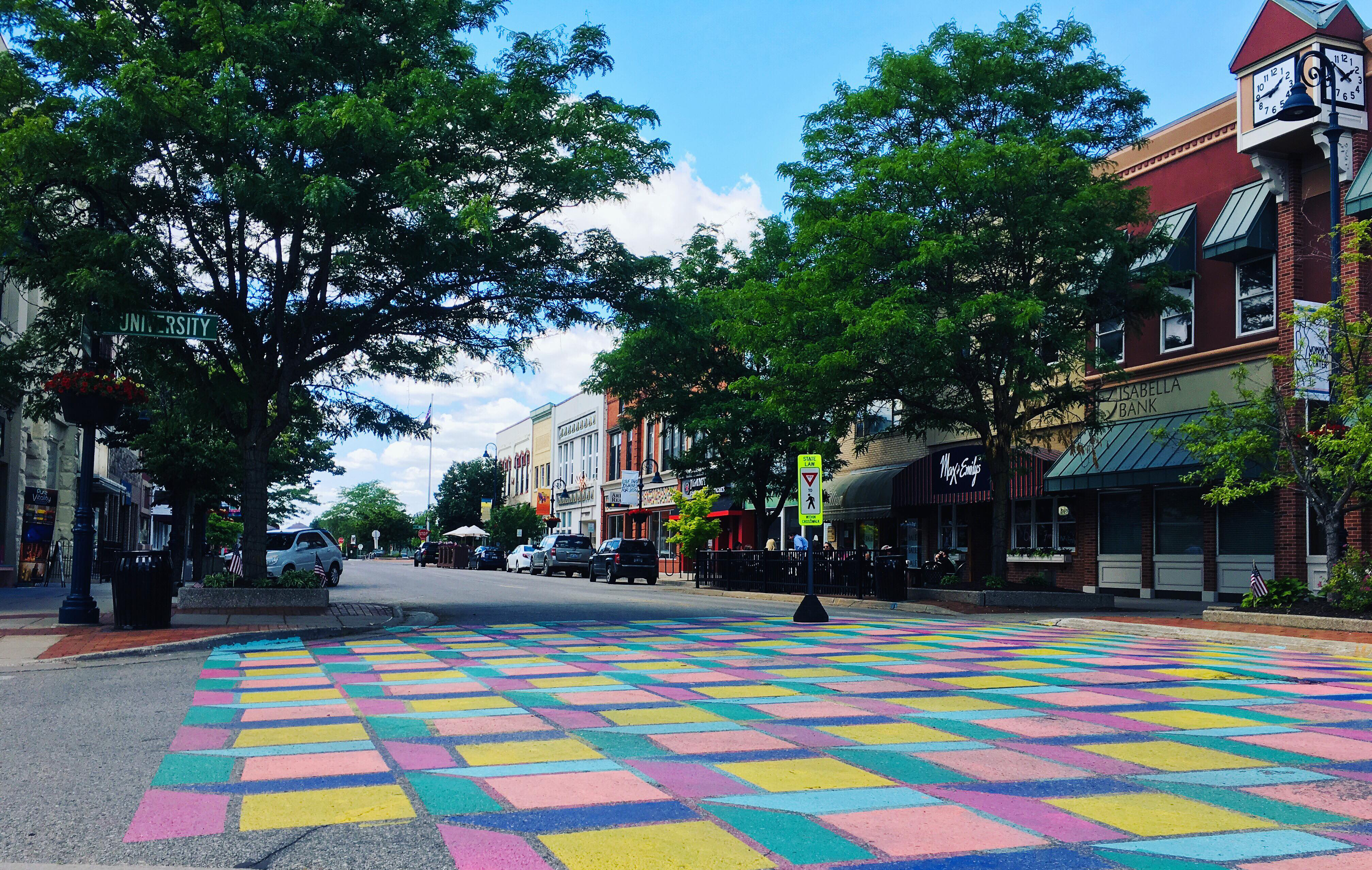 Main square of downtown Mt. Pleasant compared to downtown České Budejovice